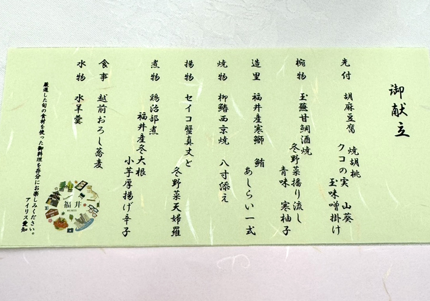 福井産の胡麻豆腐・甘鯛・寒鰤・せいこ蟹・冬大根・小芋・越前おろしそば等のたくさんの食材で郷土料理を堪能しました。